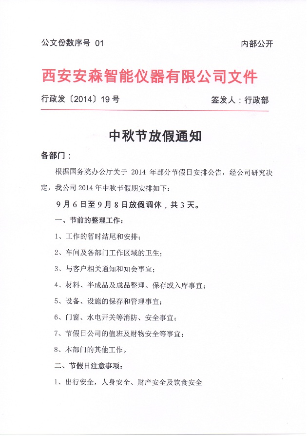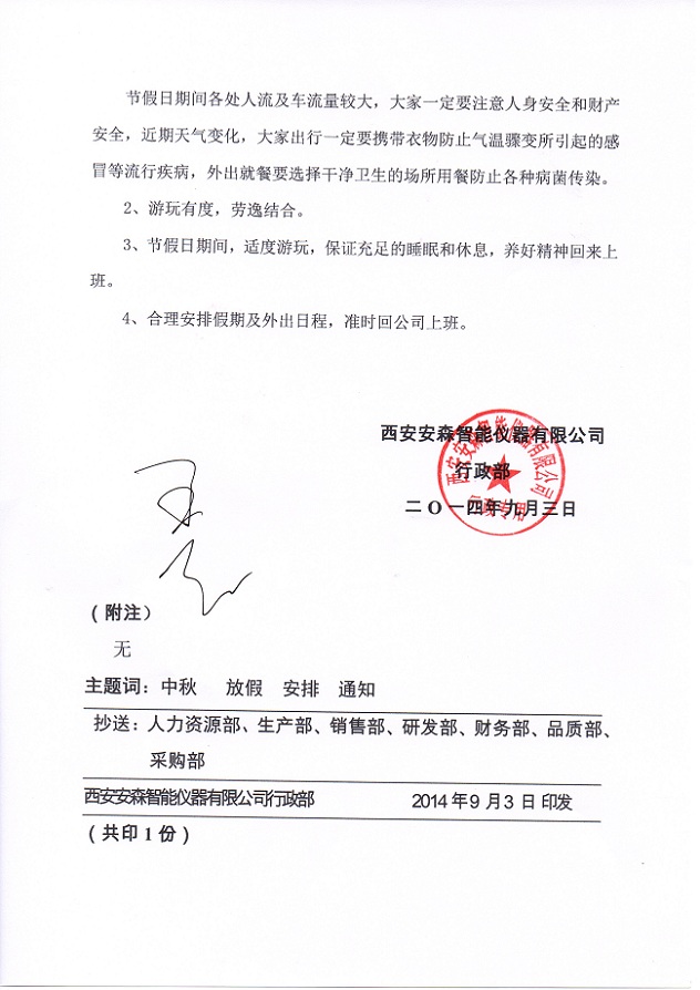 2014年中秋节放假通知